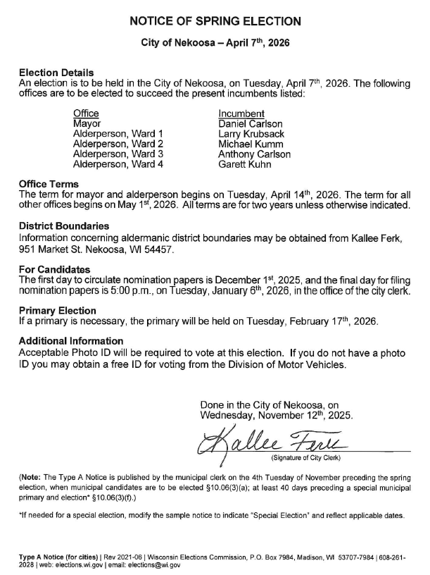 Posted on November 12, 2025, Edited November 12, 2025 by Kallee Dhein Type A Notice – Spring Elections